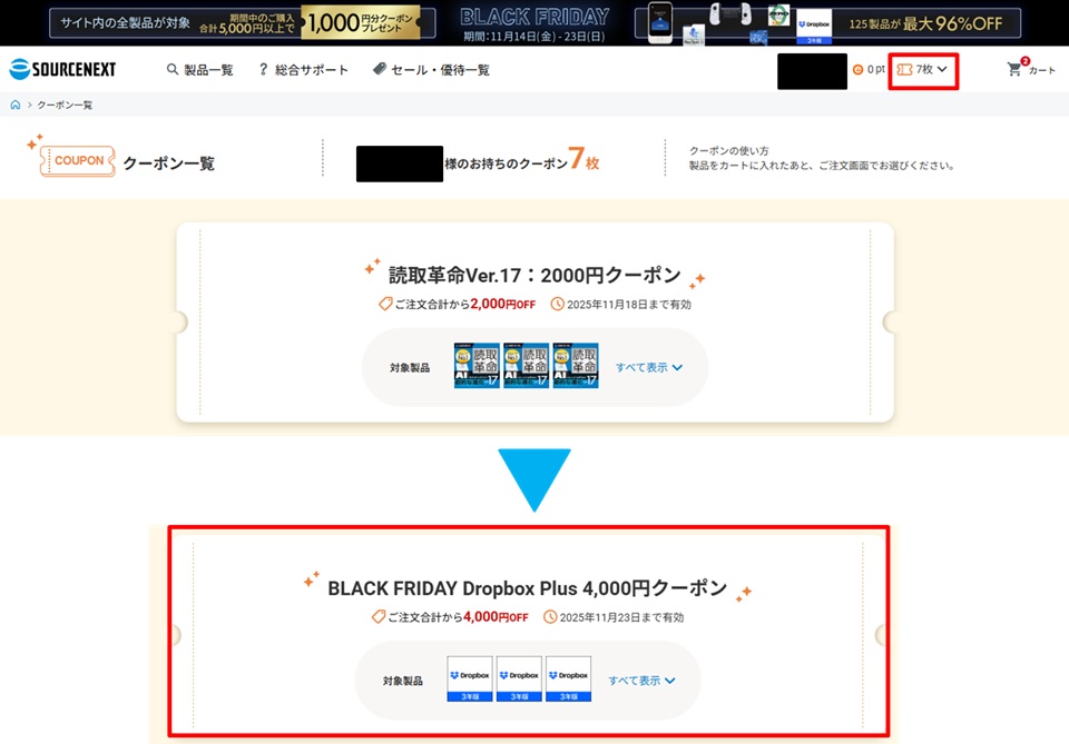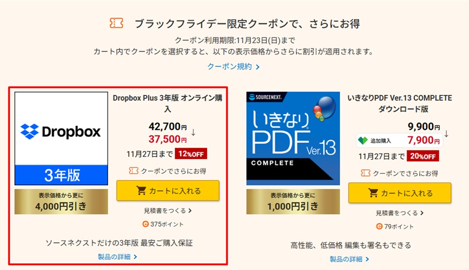 下のリンク先からソースネクストのブラックフライデーのページへ →Dropbox Plusをカートに入れる →IDを登録して購入するだけです。