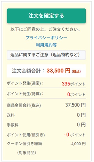 4.4000円引きになり、33,500円になりました。→「注文を確定する」をクリックします