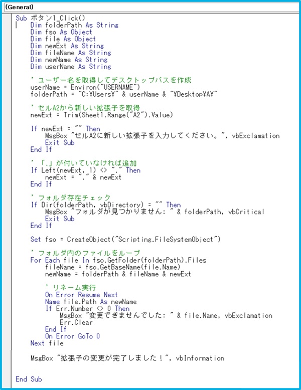 Aフォルダ内のファイルの拡張子を、A2セルの拡張子に変更する、という内容です。