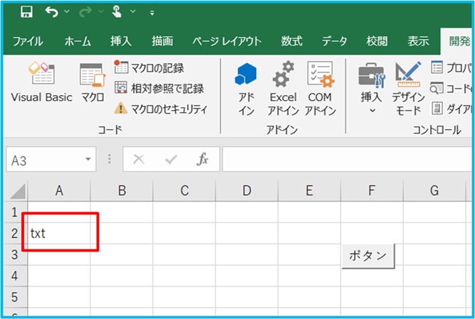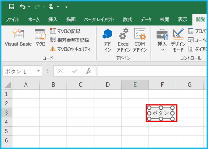 1.「開発」タブをクリック →「挿入」をクリック →「ボタン」をクリック
