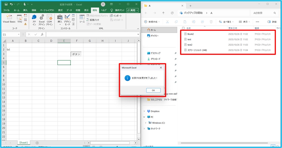 ボタンを押すと、Aフォルダ内の拡張子が「txt」に変わりました。