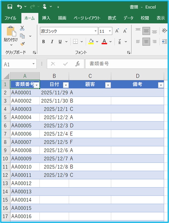 次にエクセルのリストを準備します。A列に書類番号が入っています。