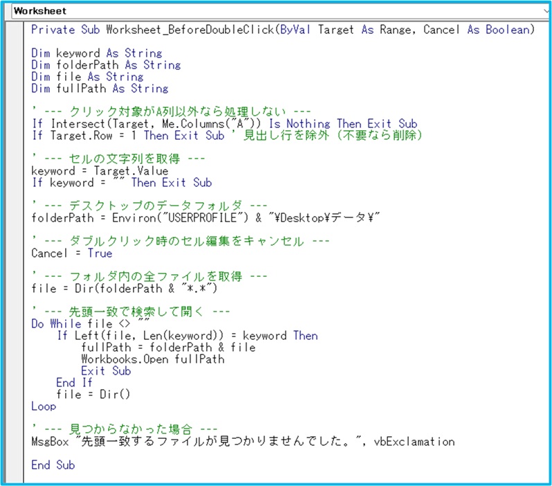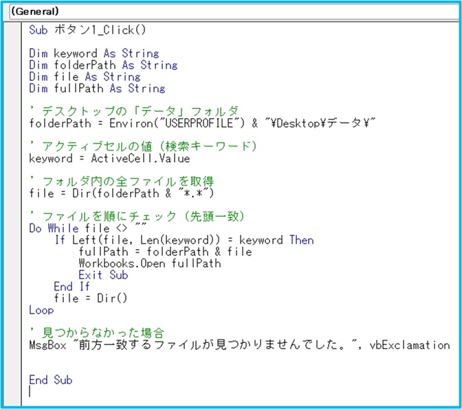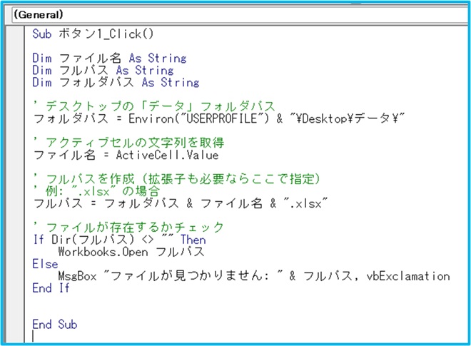 アクティブセルのファイルを、データフォルダから探して開く、という内容です。
