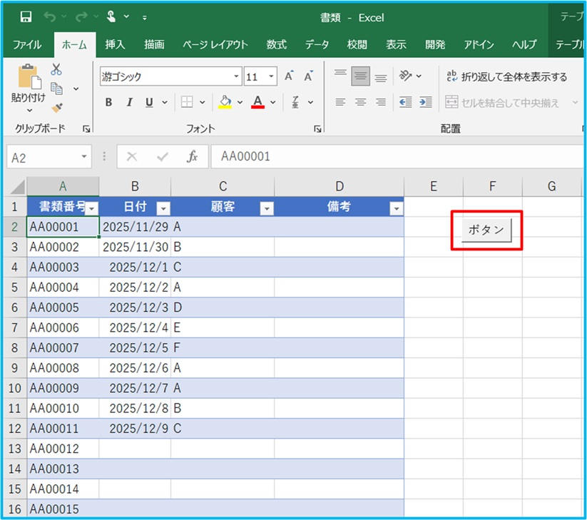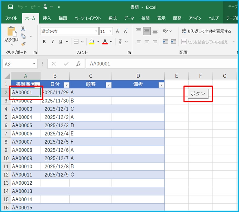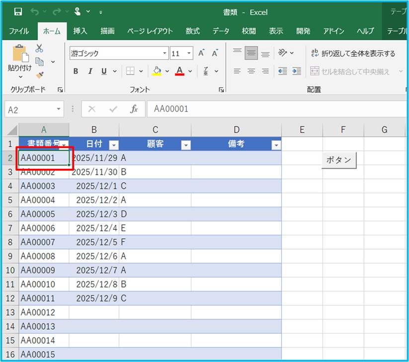 A2セルをクリックし、アクティブになったら、ボタンを押します。