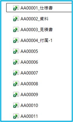実際は、ファイル名は番号だけでなく「AA00001_仕様書」のように、文字も含まれていることが多いです。