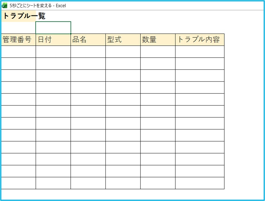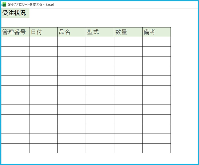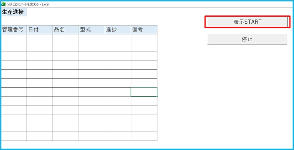 Excelを会議室モニターに全画面表示し、生産進捗・受注状況・売上速報・トラブル一覧を5秒ごとに自動切替表示する方法
