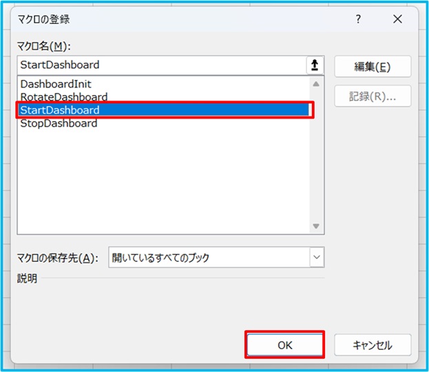 「StartDashboard」をクリック →「OK」をクリック