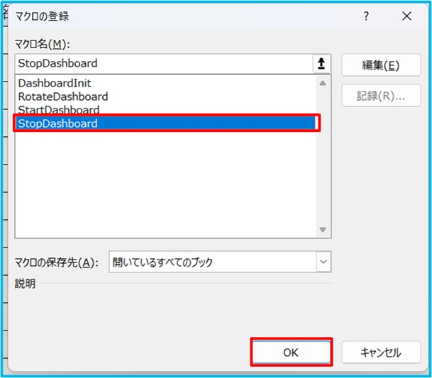 「StopDashboard」をクリック →「OK」をクリック