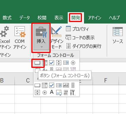「開発」タブをクリック →「挿入」をクリック →「ボタン」をクリック