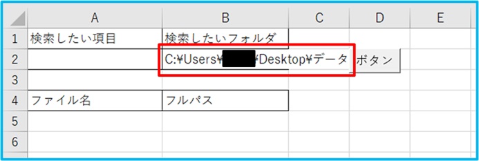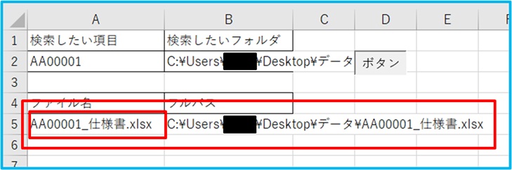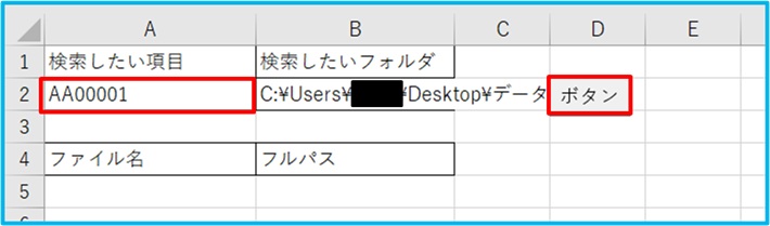 下の画像のように、A2セルに検索したい項目、B2セルに検索したいフォルダ、A5・B5セル以下に検索結果が出るようにします。