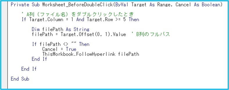 A5セル以下の結果をダブルクリックすると、ファイルが開くようになります。